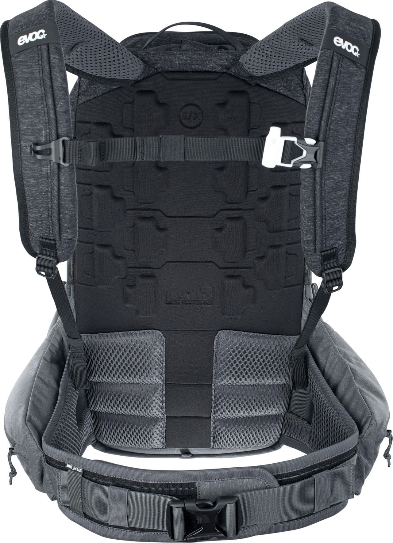 Evoc Trail posiada system Liteshield Plus. Ochraniacz pleców jest wyjątkowo lekki, elastyczny i niewrażliwy na temperaturę, zapewnia doskonałą odporność na uderzenia i pochłanianie energii. Dwuskładnikowa konstrukcja 01 składa się z połączenia polipropylenu i warstwy nośnej TPU. Granulat polipropylenu został ukształtowany pod wysokim ciśnieniem i parą i jednocześnie jest spajany z warstwą nośną - bez użycia klejów. Wysoko skompresowana pianka EPP 02 doskonale chroni klatkę piersiową, odcinek lędźwiowy i kość ogonową.