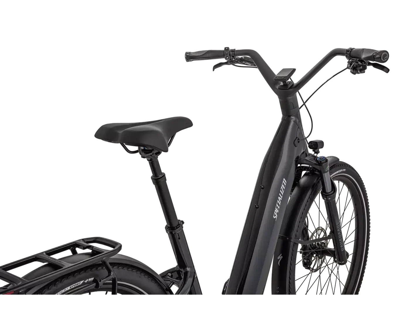 - Wyposażony w błotniki DRYTECH, przednie i tylne światła LED oraz tylny bagażnik HD o nośności 27 kg. Tylny bagażnik jest kompatybilny z dziecięcymi fotelikami rowerowymi, a rower jest również przystosowany do montażu przyczepy z osią przelotową.
