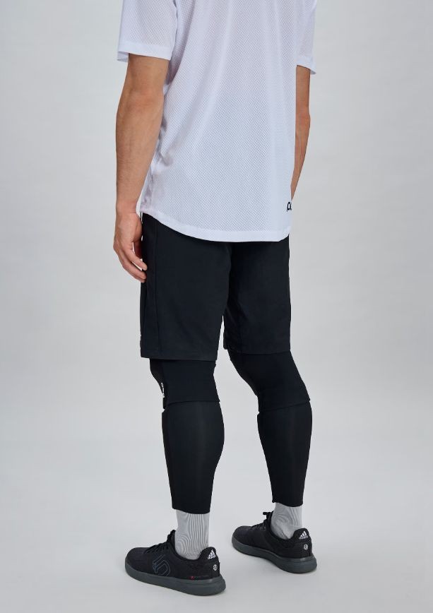 Zastosowany materiał z recyklingu w połączeniu z trwałą, hydrofobową powłoką chroni przed lekkim deszczem i wiatrem, jednocześnie pozostając przewiewny i wygodny w cieplejsze dni. Spodenki zostały zaprojektowane tak, aby dobrze współpracować z nakolannikami, bez ograniczania ruchów.
